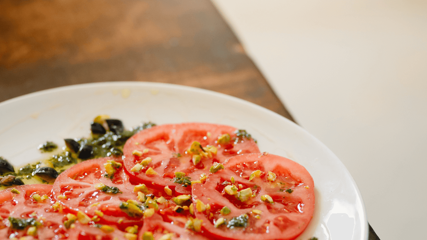 Carpaccio de tomate Monterosa conmoras, pistachos y menta